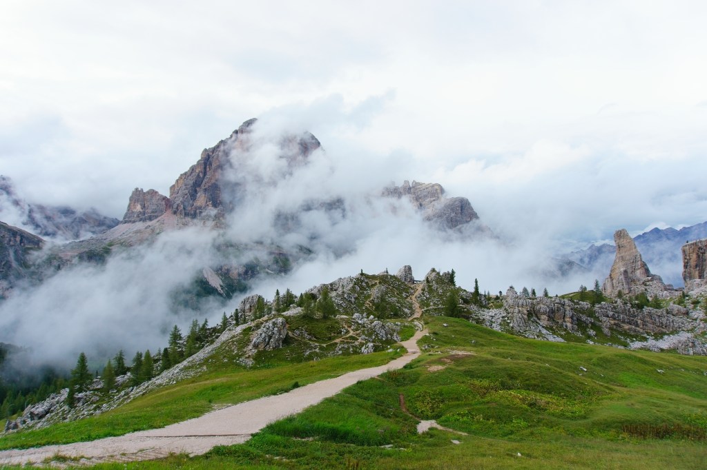 This is a picture that I took during a 1 week walking trip. We were doing the Alta Via 1 hike in the Italian Dolomites. This particular photo is outside Rifugio Scoiattoli in August in the afternoon. This is one of my favourite picture from the trip as I was trying to work on leading lines. I like that the path leads into the clouds, almost like a path to nothingness. Photo was processed a to make the greens a bit more vibrant and I think I boosted the exposure a bit.