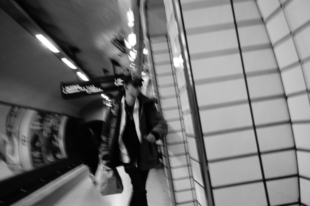 I bought my camera with me so I thought could use the journey back home to try taking some moving shots whilst on the tube. The above photo was a complete accident, I saw this person walking in a haste and I forgot I set my camera to a slower shutter speed of 1/30 seconds, I thought it was set to something faster, however, the result turned out nicer than I imagined. I like that the motion/haste of the subject is captured in this.