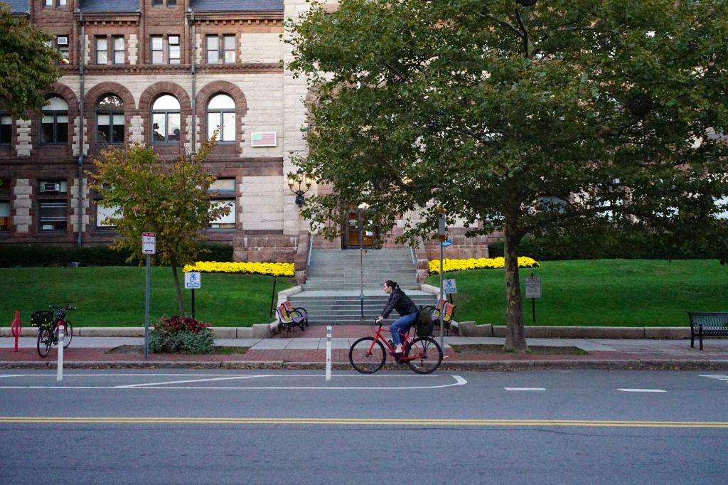 This cyclist I captured in front of the Cambridge City Hall. I used a fast shutter speed and burst mode to capture the moment before her bike overlaps with the cycle lane divider. I like the yellow flowers in the back which center the photograph.